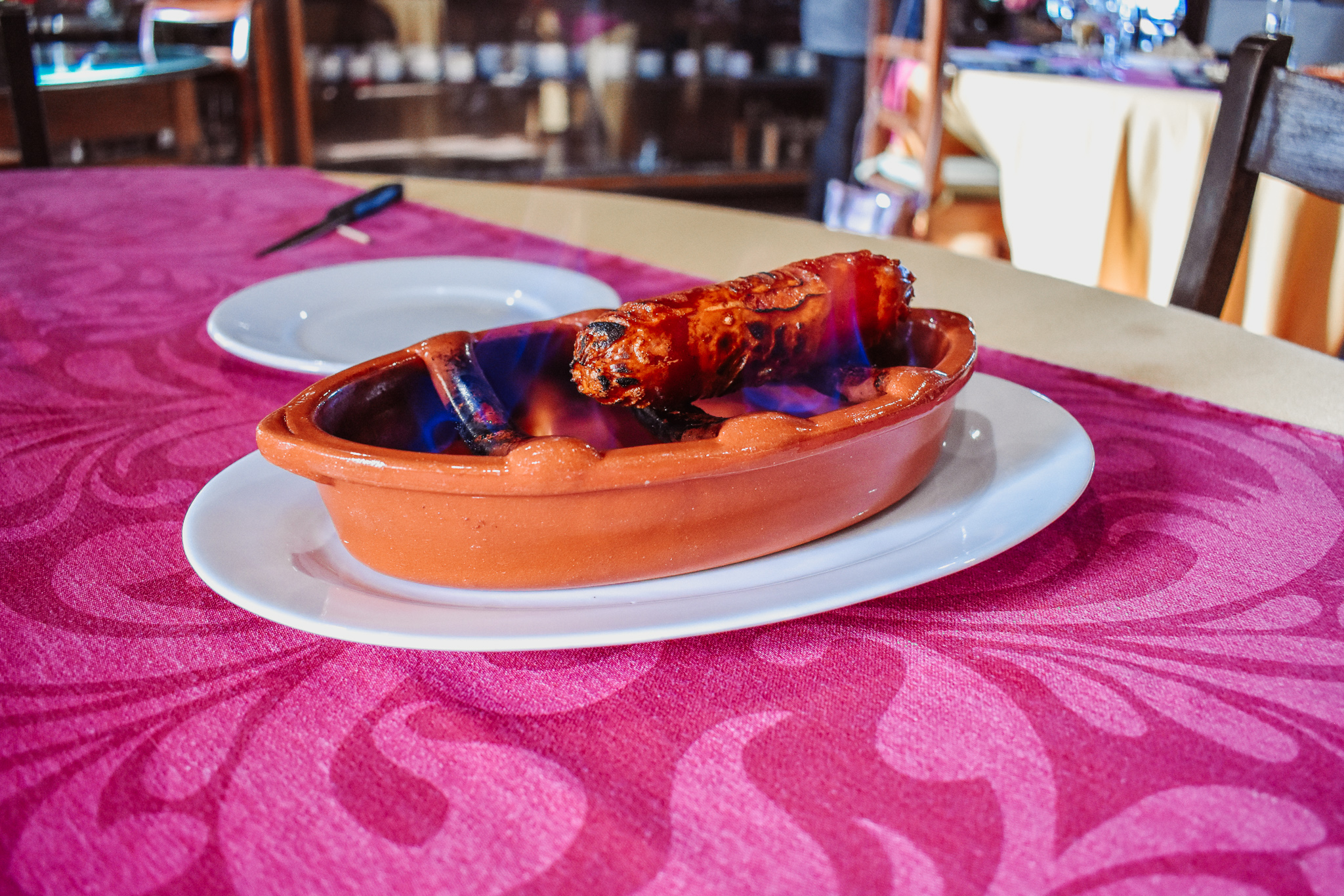 After filling up on port and our charcuterie board (which was amazing btw), Bruno drove us to our next vineyard, a small family-run operation, where we were treated to a huge Portuguese lunch pairing. Some of our favorite foods from the meal included a chickpea salad and Chouriço à Bombeiro (aka fire-roasted sausage).